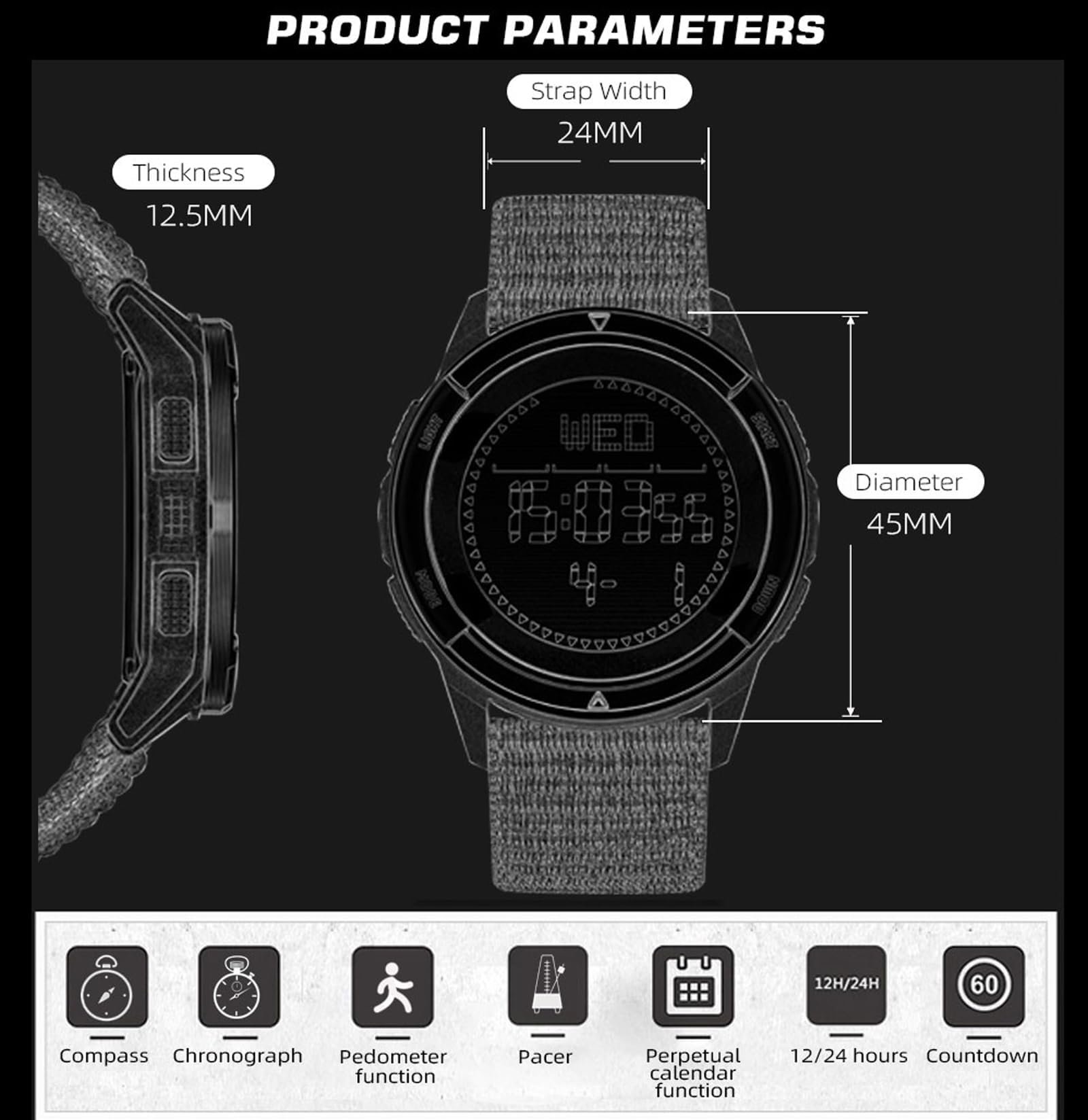 Equip with pedometer, compass, pacer, stopwatch, countdown and LED backlight.