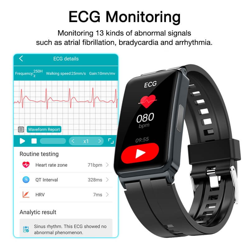 Based on intelligent pulse wave technology and medical hardware standards, through ECG measurement principle,collecting heart bio-electric signal, 30s can view ECG data. Real-time tracking of your health status through built-in sensors with 32 kinds of ECG diseases. Screening, Al ECG that can be read and understand, support ECG playback. Health report, providing intuitive and accurate ECG diagnosis report Intuitive to see diseases, potential risks, so you can understand your health anytime, anywhere.